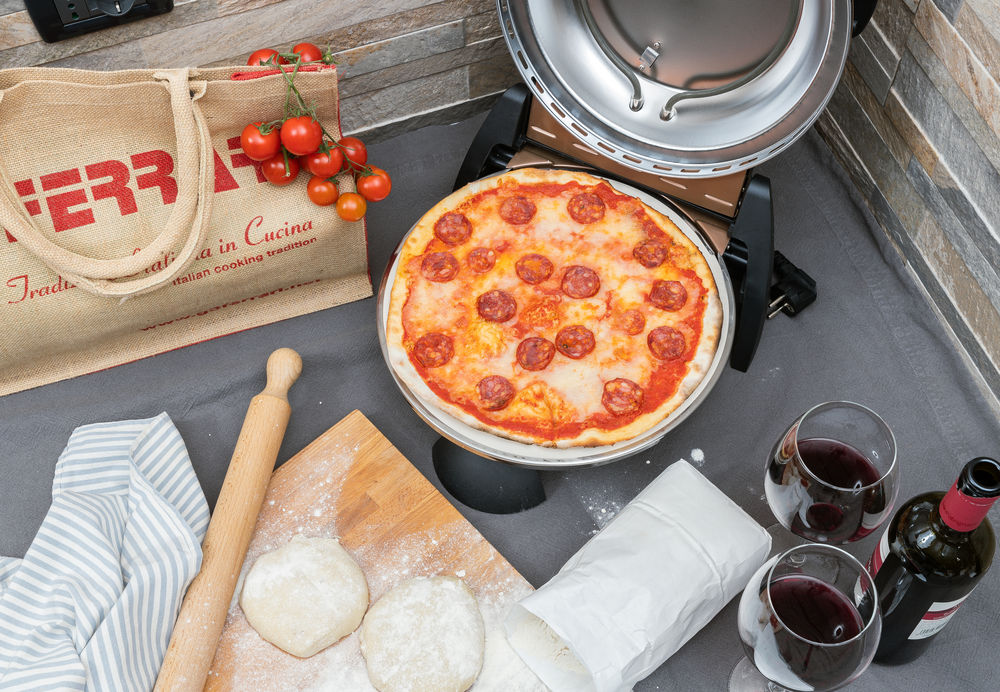 G3FERRARI G1000608 PIZZA TROUBA DELIZIA - rychlé použití - pizza za pouhé 5 minut, nastavitelný termostat do 400 ° C, časovač, žáruvzdorná kamenná deska o průměru 31cm, dvojitý topný článek, hliníková paleta pro pizzu, nedochází k úniku kouře a jiných pachů, 1200 W