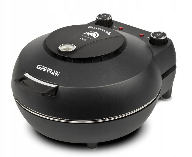 Ke spuštění topných těles a nastavení požadované teploty slouží 2 otočné ovladače, které naleznete v horní části pece na pizzu G3Ferrari G1019900. Pohybem levého ovladače zvolíte teplotu. Na výběr máte celkem z 5 teplotních stupňů. Maximální teplota je až 420 °C. O spuštění spotřebiče a dosažení vybrané teploty vás informují světelné kontrolky. Celková hmotnost činí 5,2 kg a příkon je 1200 W. |
