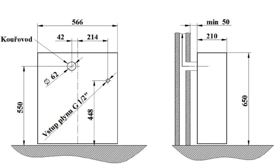 Zařízení je vybaveno zadním odtahem spalin (koleno není součástí dodávky) a funguje na principu otevřené spalovací komory – spalovací vzduch je odebírán přímo z místnosti, kde je topidlo instalováno.