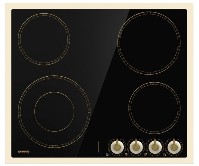 4 varné zóny HiLight (1 duozona), ovládání knoflíky, rámeček varné desky, rozměry: v x h x š 7x56x49 cm, černa a slonová kost