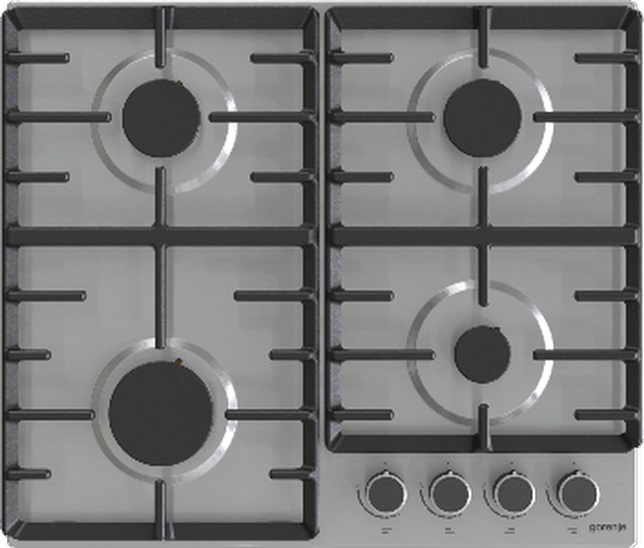 Plynová deska, 4 hořáky s pojistkami, litinové mřížky, nerez/černé knoflíky.