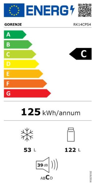 Gorenje RK14CPS4 - lednice s mrazákem dole • energetická třída C • objem chladničky 122 litrů • objem mrazničky 53 litrů • hlučnost 39 dB • klimatická třída N-ST • LED osvětlení • zaměnitelný závěs dveří • akumulační doba 8 h • 143×49,5×56,2 cm