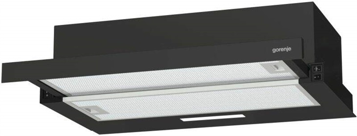 Digestoř - výsuvná, šířka 60 cm, uhlíková, černá barva, energetická třída C, hlučnost 67 dB, výkon odsávání 350 m?/h, 2 filtry, tukový filtr, průměr horního vývodu 15 cm, s LED osvětlením, vhodná do menší kuchyně (do 20 m?)