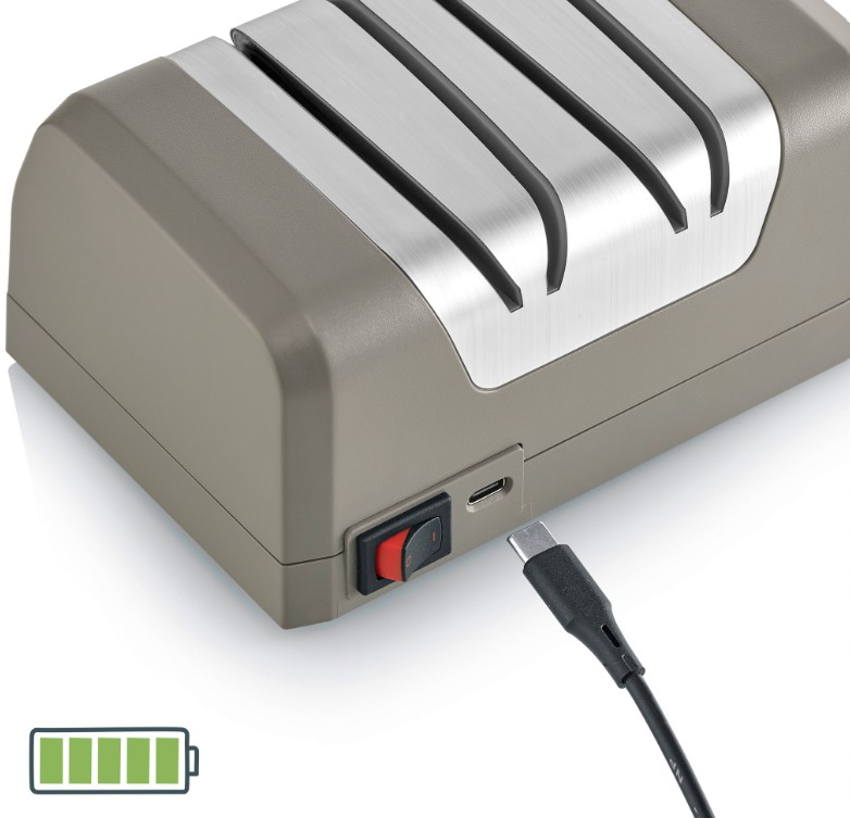 • Součástí dodávky je brousek na nože, napájecí zdroj s nabíjecím kabelem USB-C, návod k použití