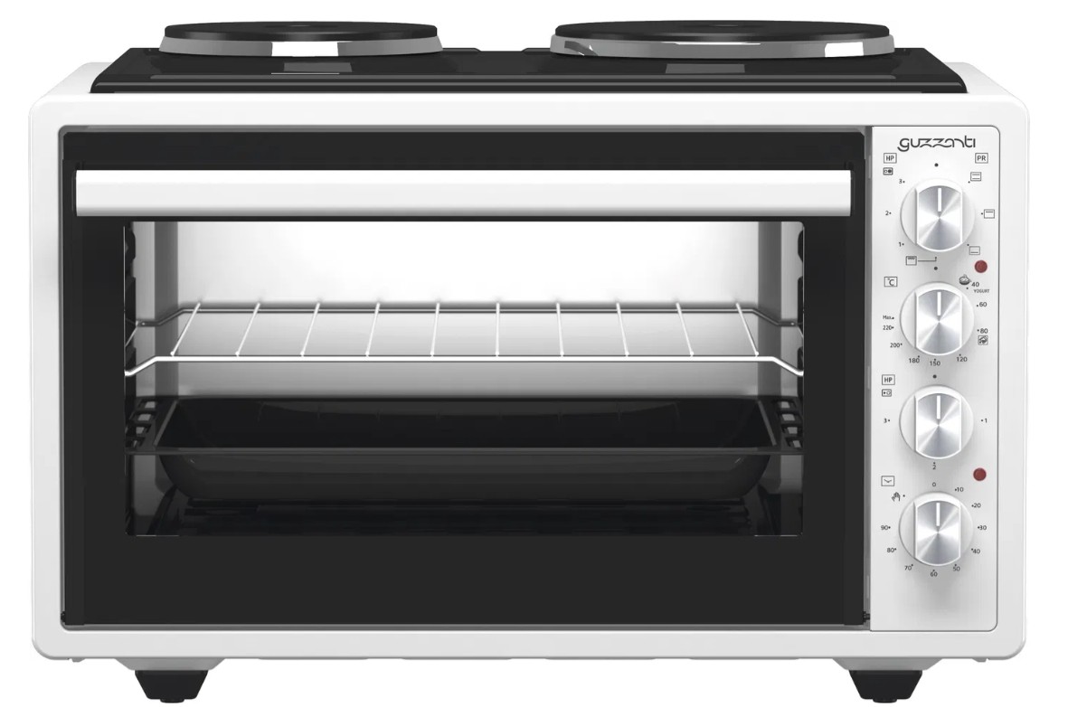 Minitrouba Guzzanti GZ 3641 - elektrická stolní trouba s 2 plotýnkami • teplota pečení od 40 °C do 220 °C • objem 42 l • 5 programů • časovač • příkon 1 950 W • horní a spodní topné těleso • parní čištění • výškově nastavitelný plech • vnější rozměry 35,4 × 55,2 × 45,9 cm • hmotnost 16,7 kg