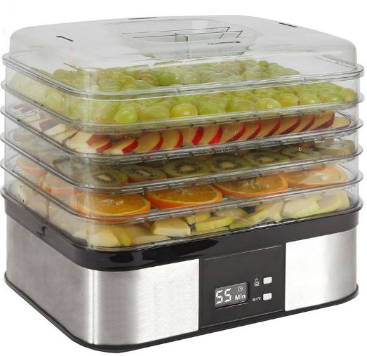 sušička ovoce • displej pro nastavení teploty sušení 40 až 70 °C • digitální časovač 1-36 hodin s automatickým vypnutím • ventilátor • počet sít 5 ks • rozměry plat 35×25 cm