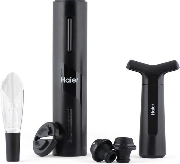 HAIER sada pro podávání a uchování vína s USB nabíječkou (1x provzdušňovač vína, 1x otvírák na víno s USB nabíječkou, 1x řezačka fólie, 1x pumpa na víno se 2 vakuovými zátkami)_k dispozici Q1/2022