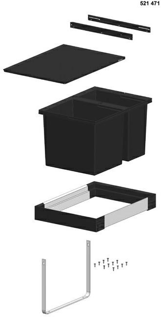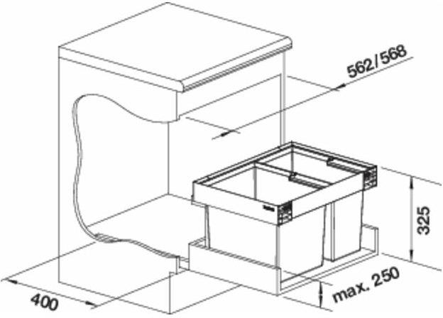 - Při plánování výšky zabudování odpadu zohledňujte výšku podesty zásuvkové skříňky, hloubku zabudování u dřezu s odtokovou sadou a z toho vyplývající nejnižší míru spodní skříňky.