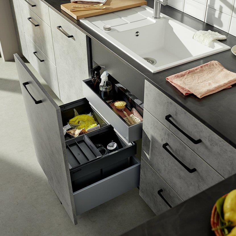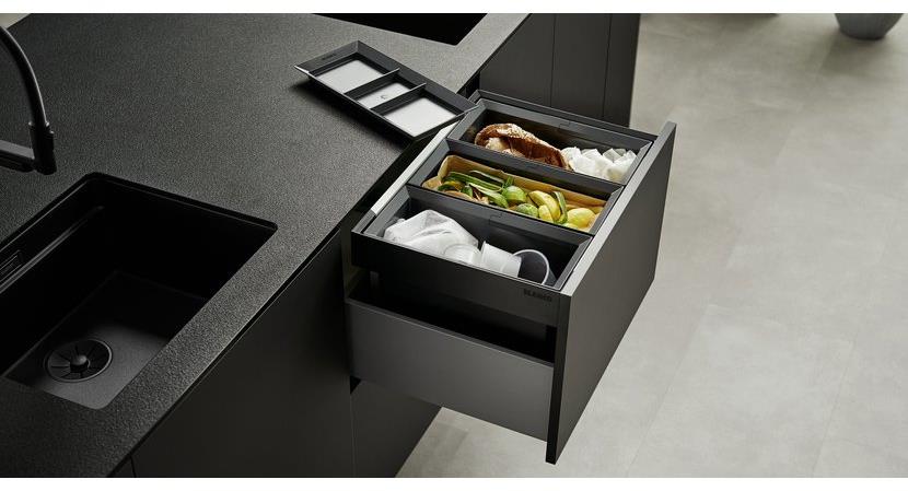 - Při plánování výšky zabudování odpadu zohledňujte výšku podesty zásuvkové skříňky, hloubku zabudování u dřezu s odtokovou sadou a z toho vyplývající nejnižší míru spodní skříňky.