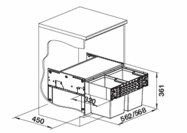 • Při plánování respektujte výšku montáže košového systému, hloubku dřezu a z toho vyplývající minimální rozměr spodní skříňky, tak aby bylo možné mezi koš a dno dřezu umístit odpadovou armaturu dřezu a rovněž tak hloubku skříňky směrem ke stěně, tak aby bylo možné dokončit montáž odpadové armatury se zápachovým sifonem za košovým systémem do odpadového otvoru.