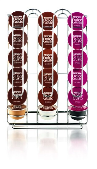 Nerezový držák na kapsle Nescafé Dolce Gusto, možnost umístění v prostoru i zavěšení na stěnu, kapacita 18 kapslí, uspořádání kapslí ve 3 sloupcích.