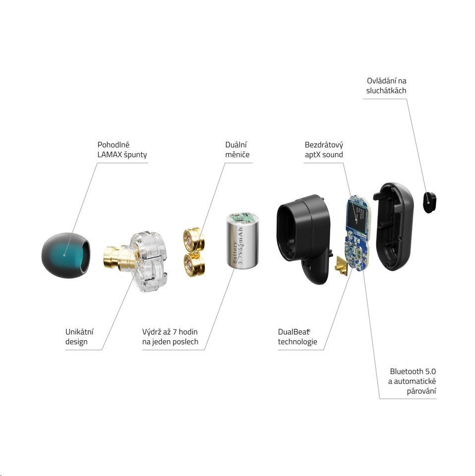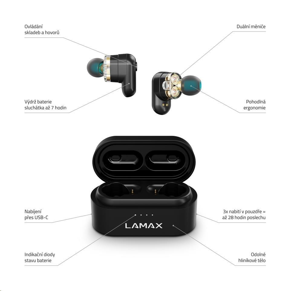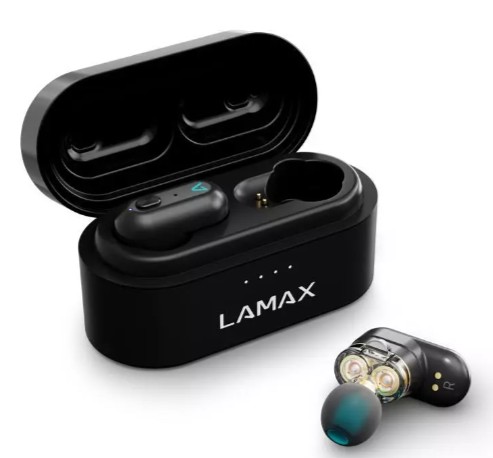 Lamax Duals1 - bezdrátová sluchátka • Bluetooth 5.0 (dosah až 15 m) • duální měniče • frekvenční rozsah 20 Hz – 20 kHz • podpora kodeků aptX, AAC, SBC • výdrž baterie až 28 hodin (s nabíjecím pouzdrem) • mikrofon s podporou handsfree i hlasových asistentů • ovládání na sluchátkách • USB-C • pasivní potlačení hluku