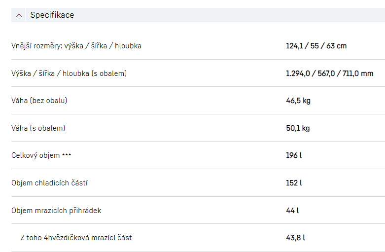 Vnější rozměry: výška / šířka / hloubka 124,1 / 55 / 63 cm
