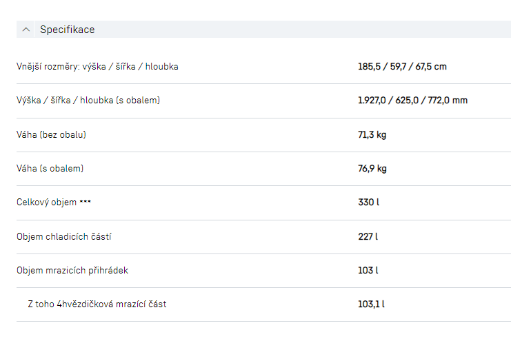 Vnější rozměry: výška / šířka / hloubka 185,5 / 59,7 / 67,5 cm