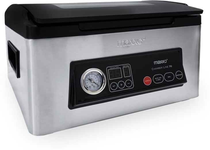 Vakuovačka Maxxo Chamber Line 70 nabízí program pro automatické i manuální vakuování. Sami se tak rozhodnete, čemu dáte přednost. Ovládací panel je umístěn na čelní straně spotřebiče. S pomocí dotykových tlačítek jednoduše nastavíte dobu odsávání a sváření a následně můžete, na přehledném ukazateli, průběžně sledovat stav podtlaku. Příkon spotřebiče dosahuje hodnoty 350 W. |