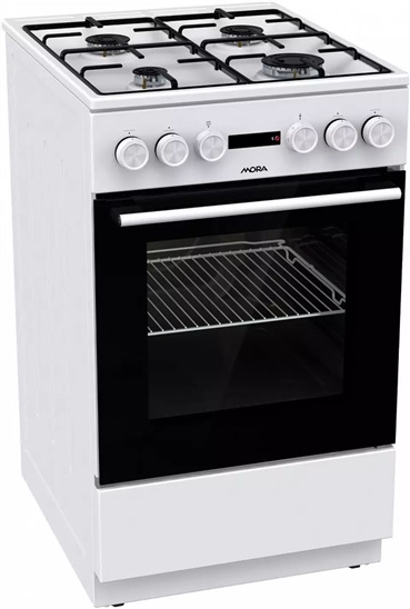 Mora K 4255 CW - kombinovaný sporák • energetická třída A • 4 hořáky • objem trouby 70 l • 9 druhů ohřevu • rychlé předehřátí • ventilátor • infračervený gril • funkce pro pizzu • FrozenBake • rozmrazování • AquaClean • bezpečnostní pojistka • otočné ovládání • displej • chladná dvířka • 85×50×59,4 cm
