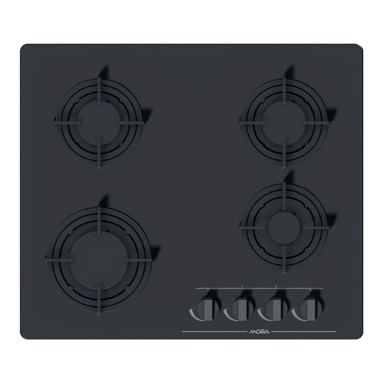 4 hořáky, el. zapalování, pojistky STOP GAS, 4 litinové podpěry, ovládání vpředu, černé tvrzené sklo