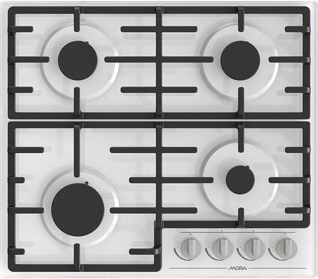 Bílá skleněná deska, 4 plynové hořáky s pojistkami Stop Gas, dvoudílná litinová vařidlová mřížka, elektrické zapalování hořáků v knoflících, skleněný povrch – tvrzené sklo, elektrické napětí 230/400 V, připojení na plyn G 1/2“