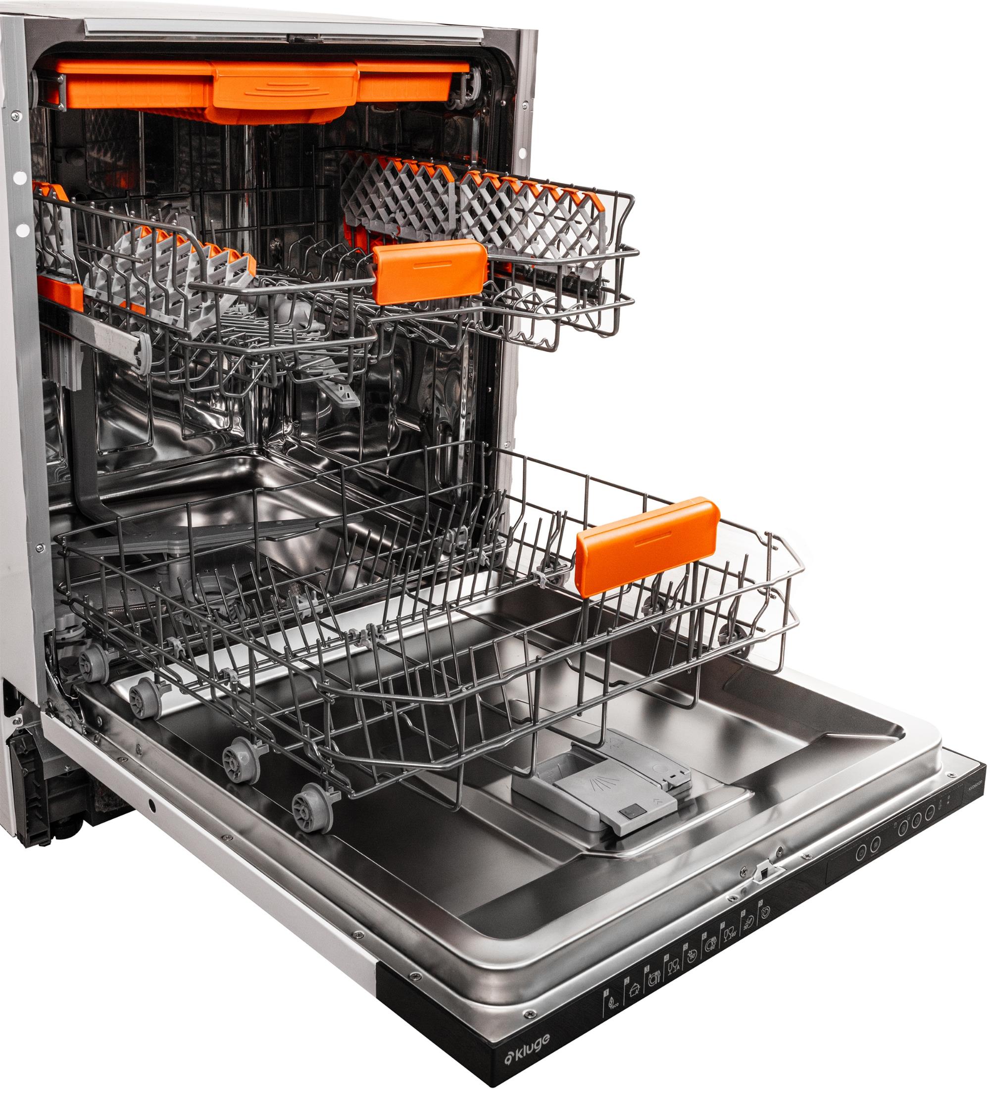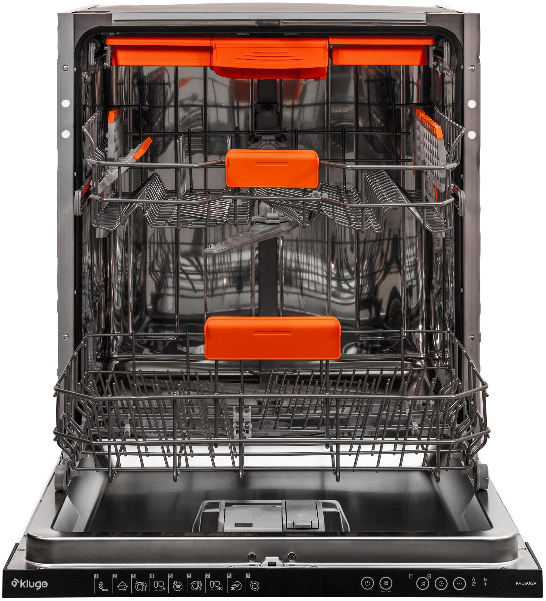 Kluge KVD6012P - vestavná myčka nádobí • energetická třída E • kapacita 13 sad nádobí • hlučnost 45 dB • 9 programů • 5 teplot • Aquastop • displej • Eco Wash • Eco Tray • InfoLED • Mini Active • odložený start • ukazatel hladiny soli a leštidla • 82×59,8×57 cm • vestavný spotřebič bez dekorativního opláštění