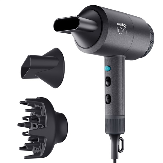 Niceboy ION AirSonic Star - fén na vlasy • příkon 2100 W • 3 stupně nastavení teploty • 2 rychlosti • ionizace • funkce studeného vzduchu • bezpečnostní pojistka • délka přívodního kabelu 1,7 m • příslušenství –? otočný koncentrátor vzduchu, difuzér