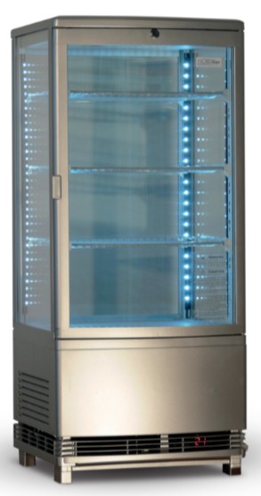Stříbrná chladicí vitrína se dvěma uzamykatelnými dveřmi vhodná pro umístění na pult. Lze obsluhovat jak ze strany prodejce, tak zákazníka. Vybavena ventilovaným chlazením, automatickým odtáváním, LED osvětlením a třemi nastavitelnými policemi.