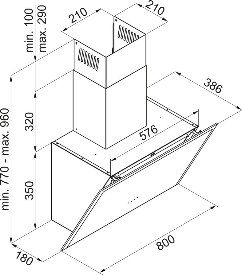 Rozměry (Š x H x V): 800 x 386 x 350 mm, výška s komínem: 770 - 960 mm