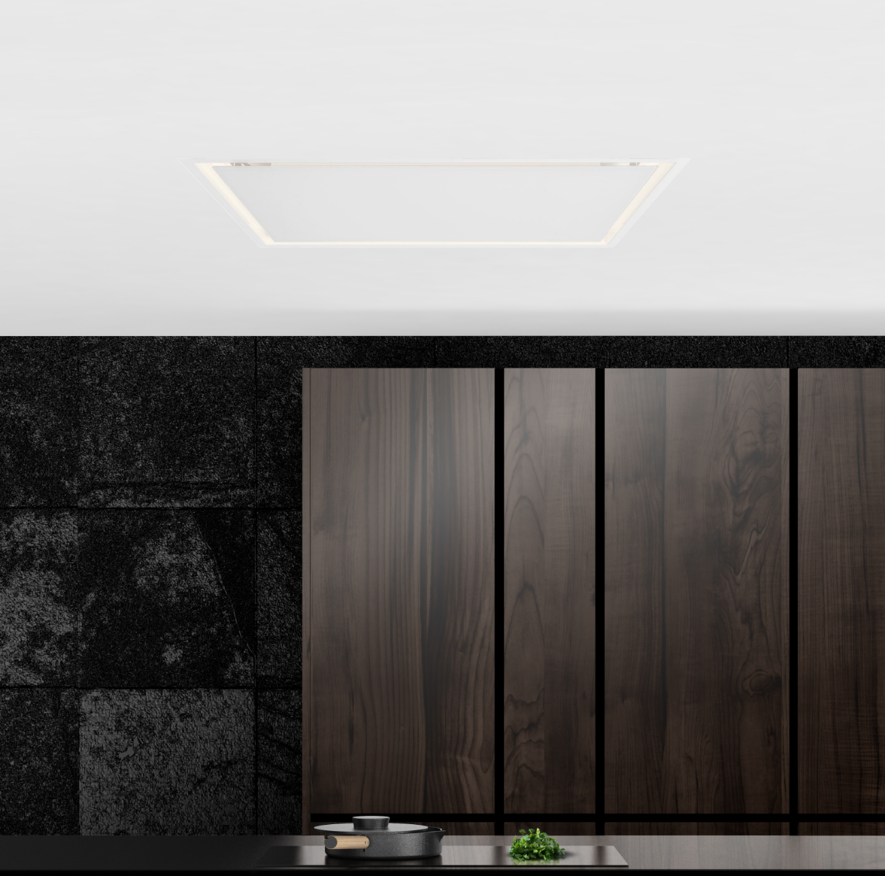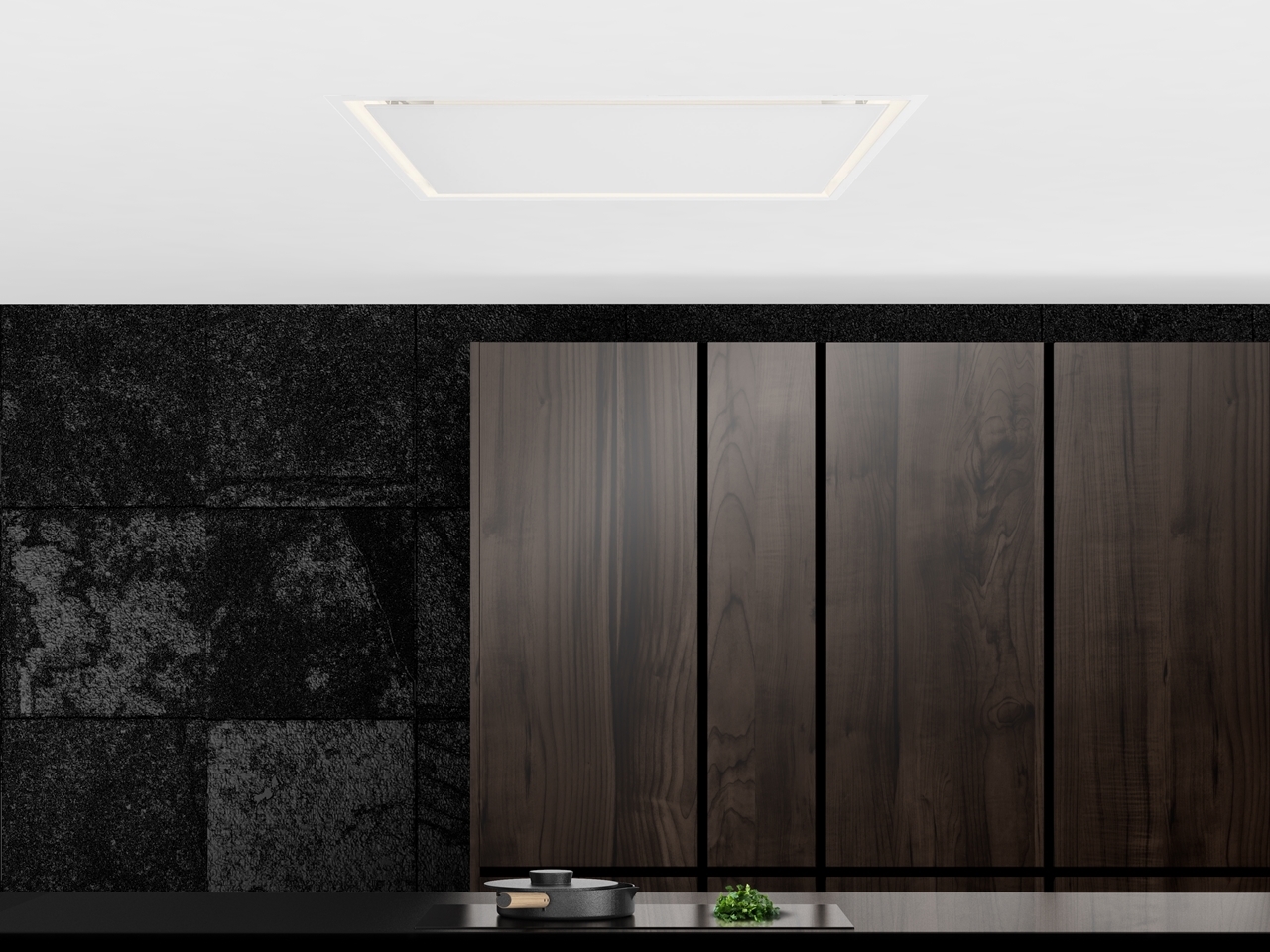 Plně vestavný stropní odsavač SU Frame White z prémiové řady designových odsavačů Ciarko Design, provedení bílý kov, šířka 90 cm, výkonný plochý motor, dálkový ovladač, 3 stupně výkonu + režim BOOST, výkon odtahu ve standardním režimu 180 - 450 m3/h, výkon odtahu v režimu BOOST 710 m3/h, hlučnost ve standardním režimu 44-64 dB(A), hlučnost v režimu BOOST 70 dB(A), roční spotřeba energie 53,1 kWh/a, energetická třída A (energetický štítek A,A,A,D), 4 x LED pásky s regulací teploty světla, provoz pouze v režimu odtahu, rozměry (V x Š x H): 187 x 900 x 600 mm