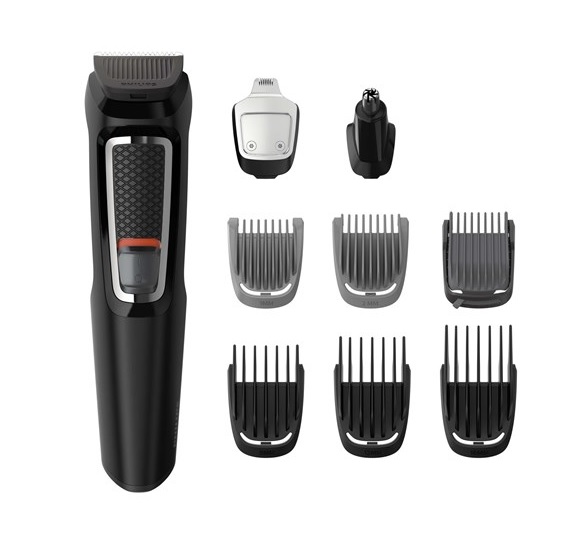 Multifunkční el. zastřihovač Philips řady 3000 9v1: 3 nástavce pro zastřihování vousů - 1, 2 a 3-7 mm; detailní zastřihovač vousů; 3 nástavec pro zastřihování vlasů 9, 12 a 15 mm; nástavec pro zastřihování chloupků v nose a uších. Doživotně ostré samoostřící čepele. Výdrž: 60 minut. Barva: černá