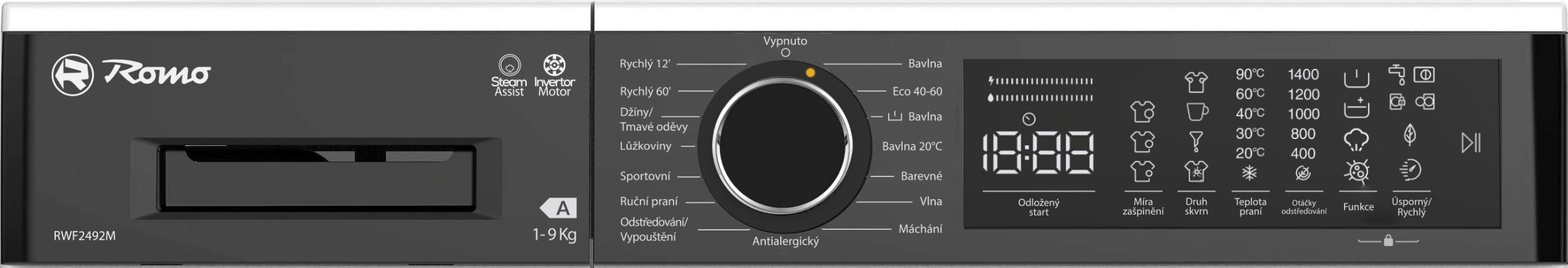 Tato pračka s předním plněním dokáže pojmout až 9 kg prádla najednou. Patří do energetické třídy A a má možnost regulovat rychlost odstřeďování až do 1400 ot./min. Snadné ovládání pomocí dotykového panelu v češtině s LED displejem a otočným voličem. Je vybavena invertorovým motorem, který je tichý, úsporný a spolehlivý. Díky systému EKO Logic šetří energii i vodu. Systém DuoJet zajišťuje optimální rozložení vody a pracích prostředků v bubnu. Perlový buben chrání prádlo před poškozením a zaručuje šetrné praní. Pračka nabízí 15 programů / 6 teplot pro různé druhy prádla: např. Rychlý 12’, Rychlý 60’, Ruční praní, Džíny, Antialergický, Tmavé prádlo nebo Barevné prádlo a také s podporou páry, která minimalizuje zmačkání prádla a snižuje práci s žehlením. Lze také nastavit stupeň zašpinění a typ skvrn pro lepší výsledky praní. Pračka umožňuje volit mezi úsporným nebo rychlým režimem praní podle potřeby. Má také funkci odloženého startu až o 23 hodin, ochranu proti přetečení, nadměrnému pěnění, autodiagnostiku poruch a dětský zámek. Systém kontroly vyvážení zajistí rovnoměrnou distribuci prádla v bubnu. Rozměry pračky jsou (VxŠxH): 84,5 x 59,7 x 58,2 cm, váha 74 kg.