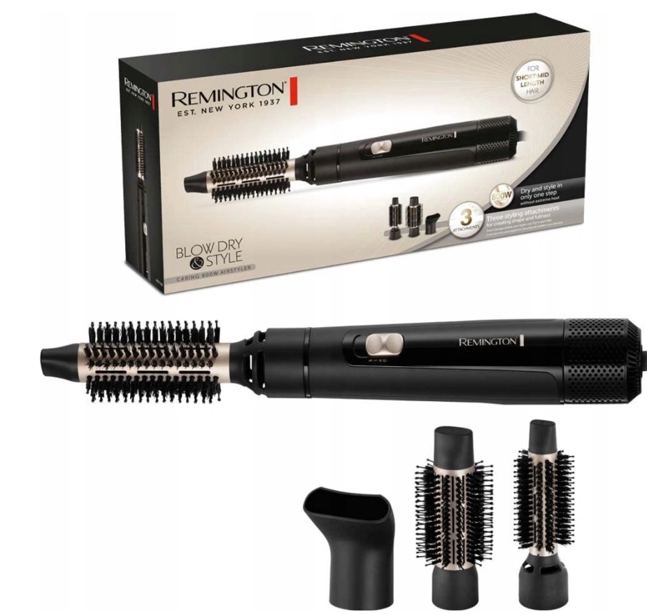 Remington AS7300 - horkovzdušný kartáč • 2 rychlostní stupně • funkce studeného vzduchu Cool Shot • odnímatelná mřížka • otočný přívodní kabel • poutko na zavěšení • příkon 800 W • příslušenství – 3 nástavce (koncentrátor vzduchu, kartáče o průměru 25 a 38 mm s keramickým povrchem a smíšenými štětinami)