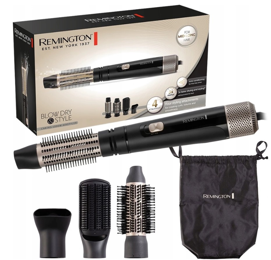 Remington AS7500 - horkovzdušný kartáč • pro vysoušení a styling vlasů • ionizace • 2 rychlostní a teplotní stupně • otočný přívodní kabel • poutko na zavěšení • příkon 1000 W • příslušenství – plochý kartáč, koncentrátor vzduchu, kartáč o průměru 38mm, kartáč o průměru 50mm