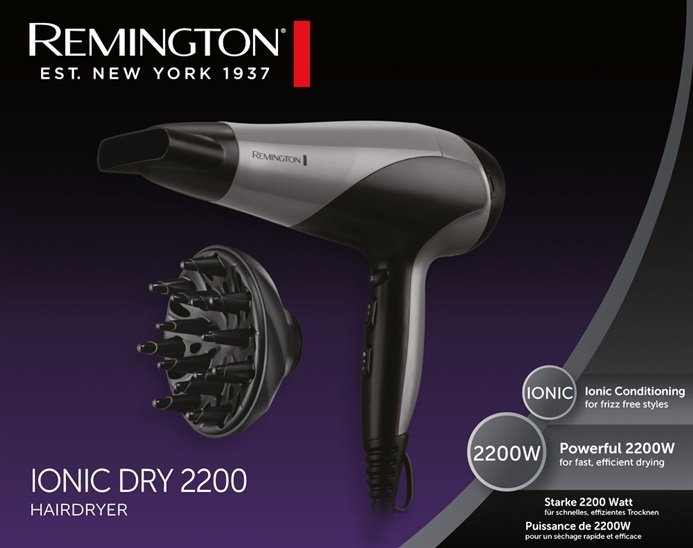 Remington D3190S - fén na vlasy • příkon 2200 W • 3 stupně nastavení teploty • 2 rychlosti • ionizace • funkce studeného vzduchu • poutko pro uchycení • odnímatelná kovová mřížka • koncentrátor vzduchu • difuzér • délka přívodního kabelu 1,8 m