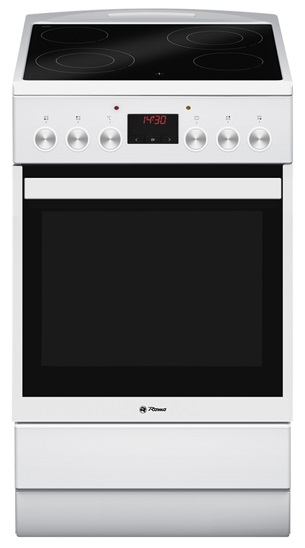 Sporák 50 cm široký se sklokeramickou varnou deskou a horkovzdušnou el. troubou; objem 65 l; en. třída A; el. displej s časovačem; 10 funkcí trouby vč. rychlého ohřevu, rozmrazování a grilu; vnitřní osvětlení trouby; šedý smalt, 3 skla ve dveřích, rozměry (VxŠxH): 85x50x60cm, bílý