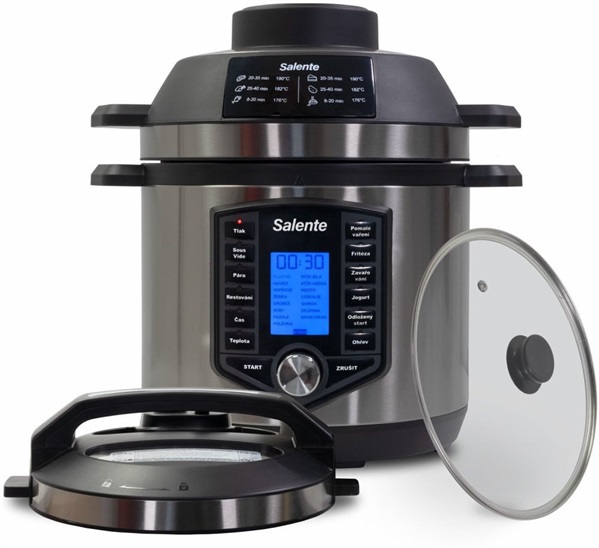 Režimy vaření se liší podle použití jednotlivých pokliček a programů. Balení multifunkčního hrnce Salente Ario+ obsahuje tři poklice: horkovzdušnou troubu, poklici pro tlakové vaření a skleněnou poklici pro restování.