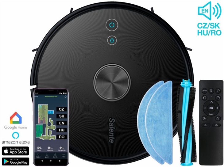 robotický vysavač • režim vysávání • režim mopování • doba úklidu až 180 minut • omyvatelný HEPA filtr • 360° laserová navigace • BLDC motor NIDEC • TURBO kartáč • TOF senzor • nastavitelné zóny úklidu • virtuální zeď • na všechny typy podlah • přizpůsobí sací výkon typu povrchu • 600ml prachová nádoba • mopovací textilie • zásobník na vodu 2v1 • dotykové ovládání • dálkové ovládání • mobilní aplikace Salente v češtině • podpora hlasových asistentů Google Home a Amazon Alexa