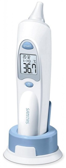 Digitální teploměr do ucha s vyměnitelnými krytkami pro měření různých osob, 10 pamětí, varovný tón při překročení teploty 37,5°C, alarm nad teplotu 38°C