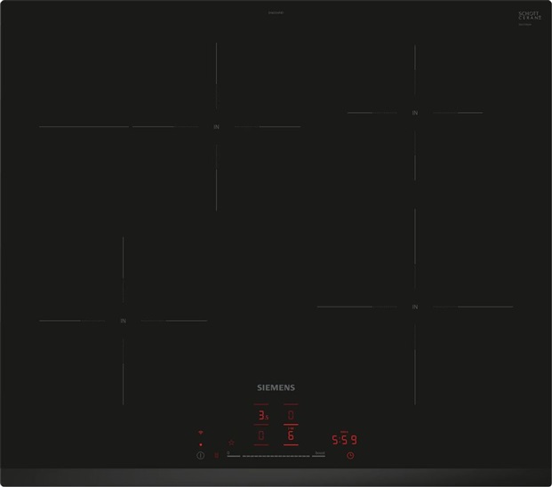 indukční varná deska, 60 cm, 4 indukční varné zóny, z toho 1 s rozšířením na pečicí zónu, ovládání touchSlider+, Intelligent hood automatic, powerBoost, dětská pojistka, 2stupňový ukazatel zbytkového tepla pro každou varnou zónu, příkon: 7,4 kW, přední fazeta