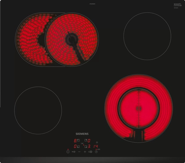elektrická varná deska, 60cm, 4 varné zóny, z toho 1 dvouokruhová a 1 pečicí zóna, 2stupňový ukazatel zbytkového tepla pro každou varnou zónu, ovládání touchControl, funkce reStart, dětská pojistka, fazeta vpředu