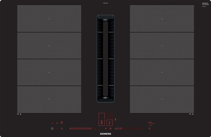 indukční varná deska s odsáváním, 80 cm, 2 zóny flexIndukce, fryingSensor Plus, bez rámečku - zapustitelná do pracovní desky, ovládání dual lightSlider, MoveMode, PanBoost, PowerBoost, dětská pojistka, 2stupňový ukazatel zbytkového tepla pro každou varnou zónu, příkon: 7,4 kW; odsavač par: iQdrive motor, climateControl Sensor - plně automatické nastavení odtahu, normální stupeň 500 m3/hod, intenzivní stupeň 622 m3/hod, hlučnost odsávání při normálním stupni min./max.: 42/69 dB