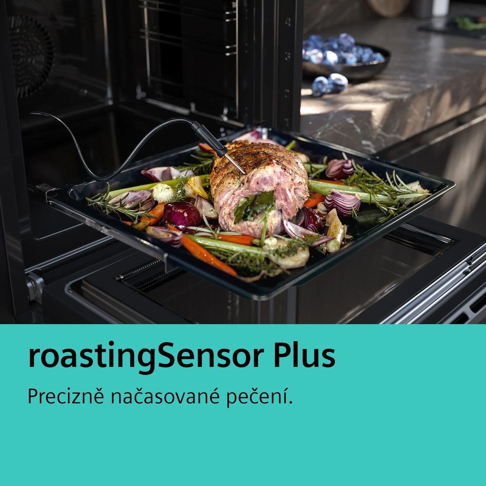Siemens HS736G3B1 - kombinovaná parní trouba, zásobník na vodu umístěn za ovládacím panelem, A+, 21 druhů ohřevu, 100% pára, LED osvětlení, TFT-Touchdisplay Plus, objem 71l, roastingSensor Plus teplotní sonda, cookControl Pro, softMove, ecoClean čištění na zadní stěně, hydrolytické čištění humidClean, dětská pojistka, černá
