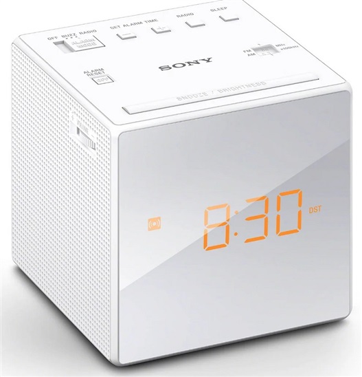 Radiobudík, LCD displej, alarm s možností odloženého buzení, analogový tuner, barva bílá.