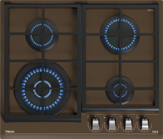 Skleněná plynová varná deska; šíře 60 cm; Urban Colors London Brick Brown/hnědá; zkosená přední hrana; 4 varné zóny: trojitý kruhový hořák/4,0kW a hořáky 2,8kW + 1,75kW + 1,0kW; 2 litinové mřížky; otočné ovladače; 9 stupňů výkonu; automatické zapalování; bezpečnostní zámek; typ plynu: zemní/PB.