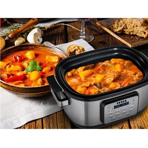 Tesla MultiCook M80 Deluxe - multifunkční hrnec • objem nádoby 6 l • příkon 1250 W • nastavení teploty 40 do 280 °C • 10 programů • možnost ručního nastavení času a teploty • nepřilnavý keramický povrch • LCD displej • ovládání v češtině • funkce Odloženého startu (až o 24 hodin) • digitální časovač • režim Udržování teploty • příslušenství – barevná kuchařka s recepty, nerezový košík na smažení pokrmů, nerezový držák pro vaření metodou Sous-vide
