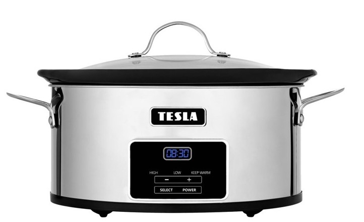 Tesla SlowCook S800 Deluxe - Pomalý hrnec s objemem 5.6 l, nerezový povrch, keramická nádoba, možnost zapečení v troubě, skleněná poklička, odložený start, udržení teploty, digitální displej, držák pro napájecí kabel, příkon 250 W