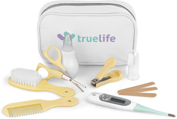 Kompletní sada pro péči o dítě, cestovní pouzdro, nůžky, kleštičky, pilníky na nehty, kartáč na vlasy s jemnými štětinami, hřeben, zubní kartáček na prst, odsávačka hlenů, teploměr TrueLife Care T3 - měření za 5 vteřin, ohebná špička, tříbarevný displej.