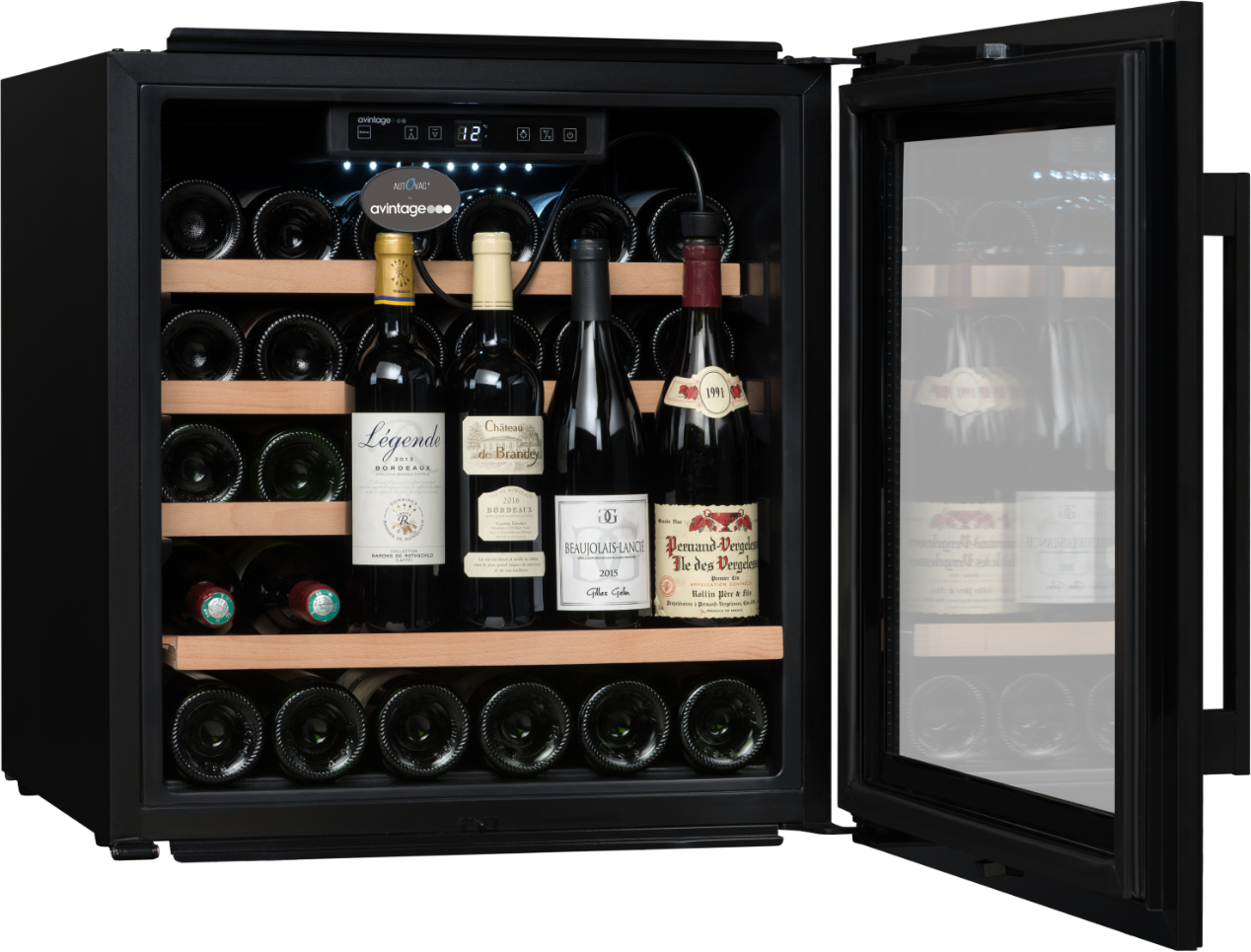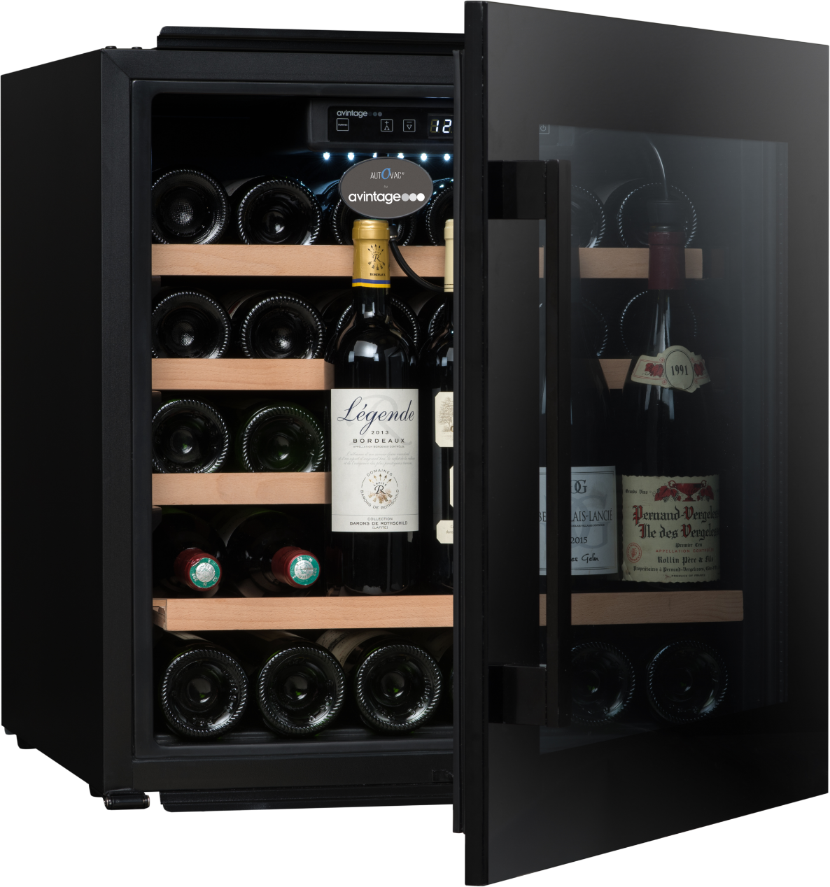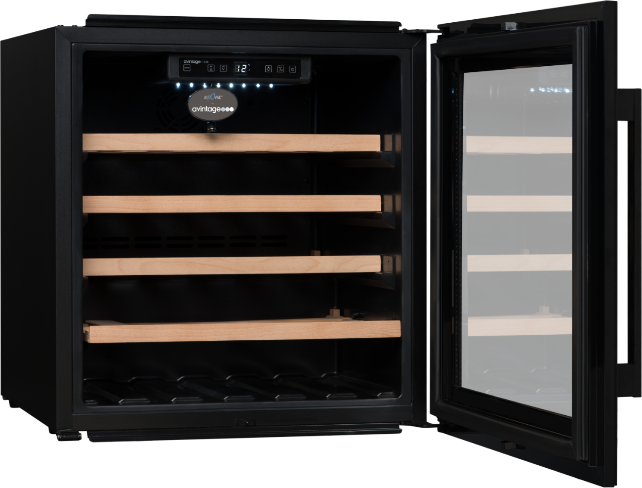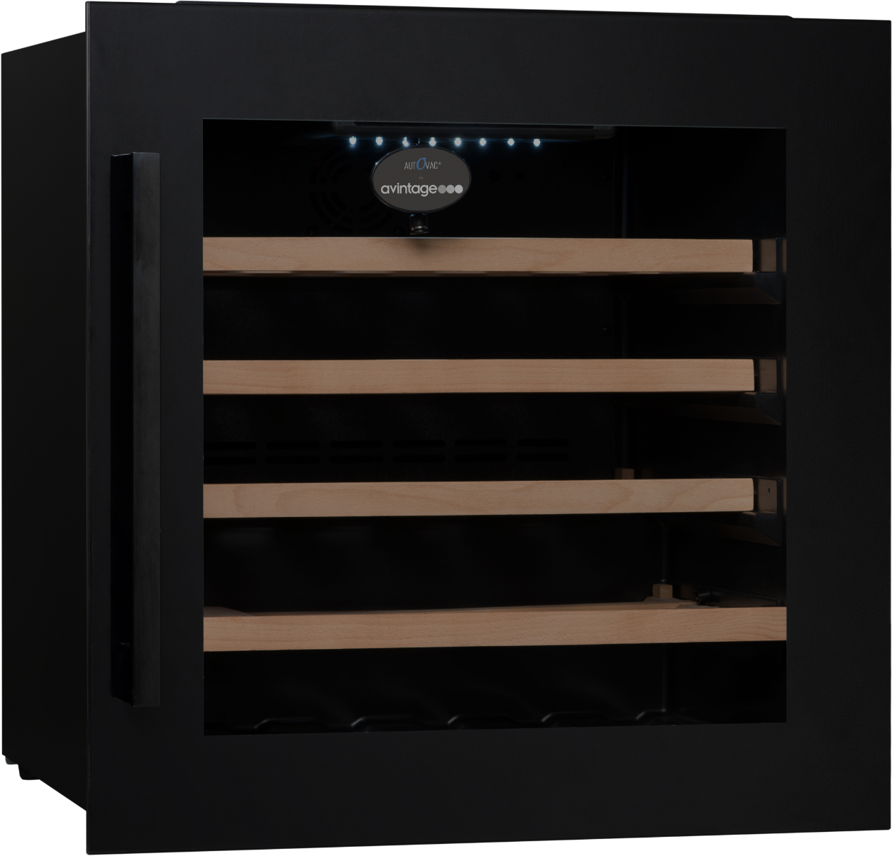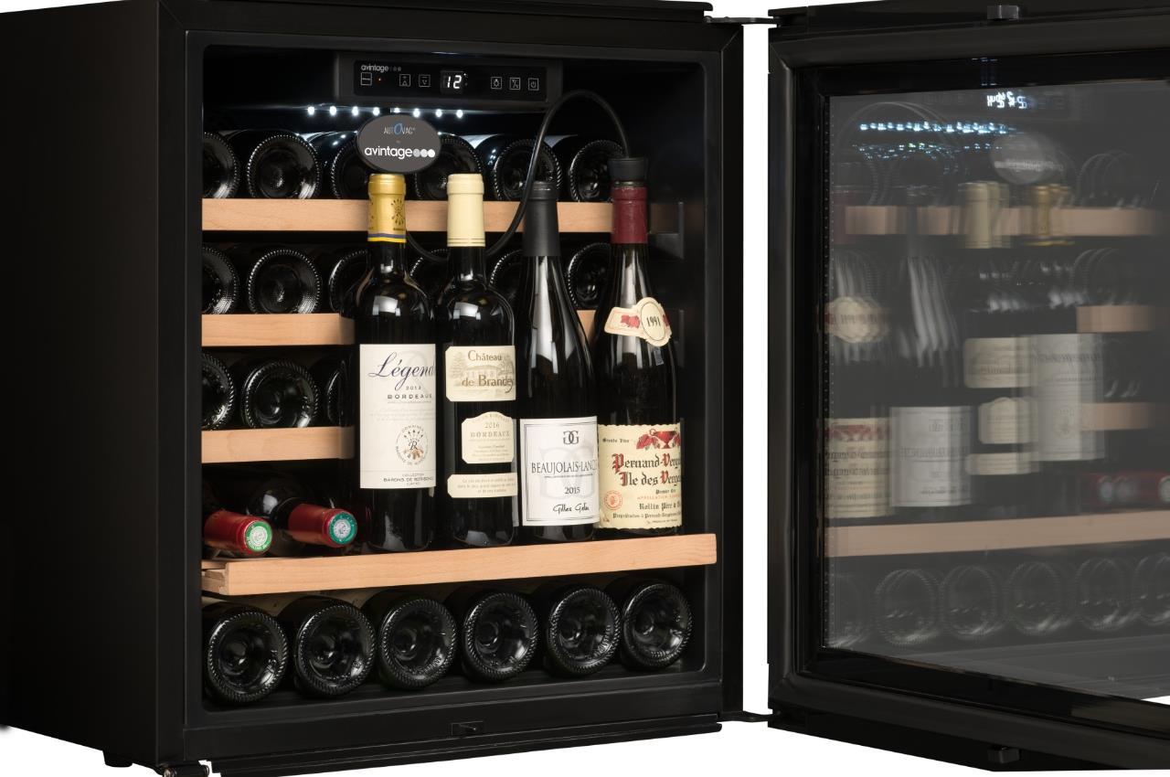 Exkluzivní vestavná vinotéka značky Avintage vhodná k instalaci do stejného korpusu jako standartní pečící trouba (60 x 60 cm); Celková kapacita 33 lahví, rozsah nastavení teplot: 5-20 °C; Integrovaný vakuový systém AutoVac umožňující delší uchovávání otevřených lahví s vínem; Prosklené dveře s černým madlem a rámem dveří z černého skla; 3 vrstvy tvrzeného šedě tónovaného skla s UV filtrem; Černé tělo vinotéky; Bílé LED osvětlení s vypínačem; 4 výškově nastavitelné nožky; 1 pevná police z bukového dřev; 3 ks výsuvných polic z bukového dřeva; Elektronická regulace teploty; Displej v bílé barvě; Automatické odmrazování; Regulace vlhkosti; Systém aktivní ventilace; Antivibrační systém; Kompatibilní s aplikací Vinotag;