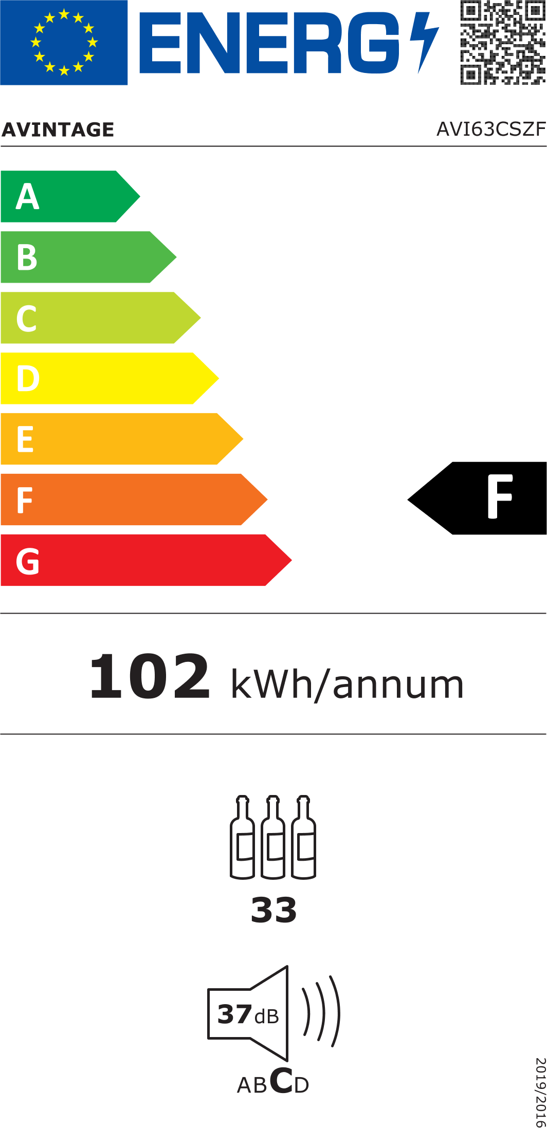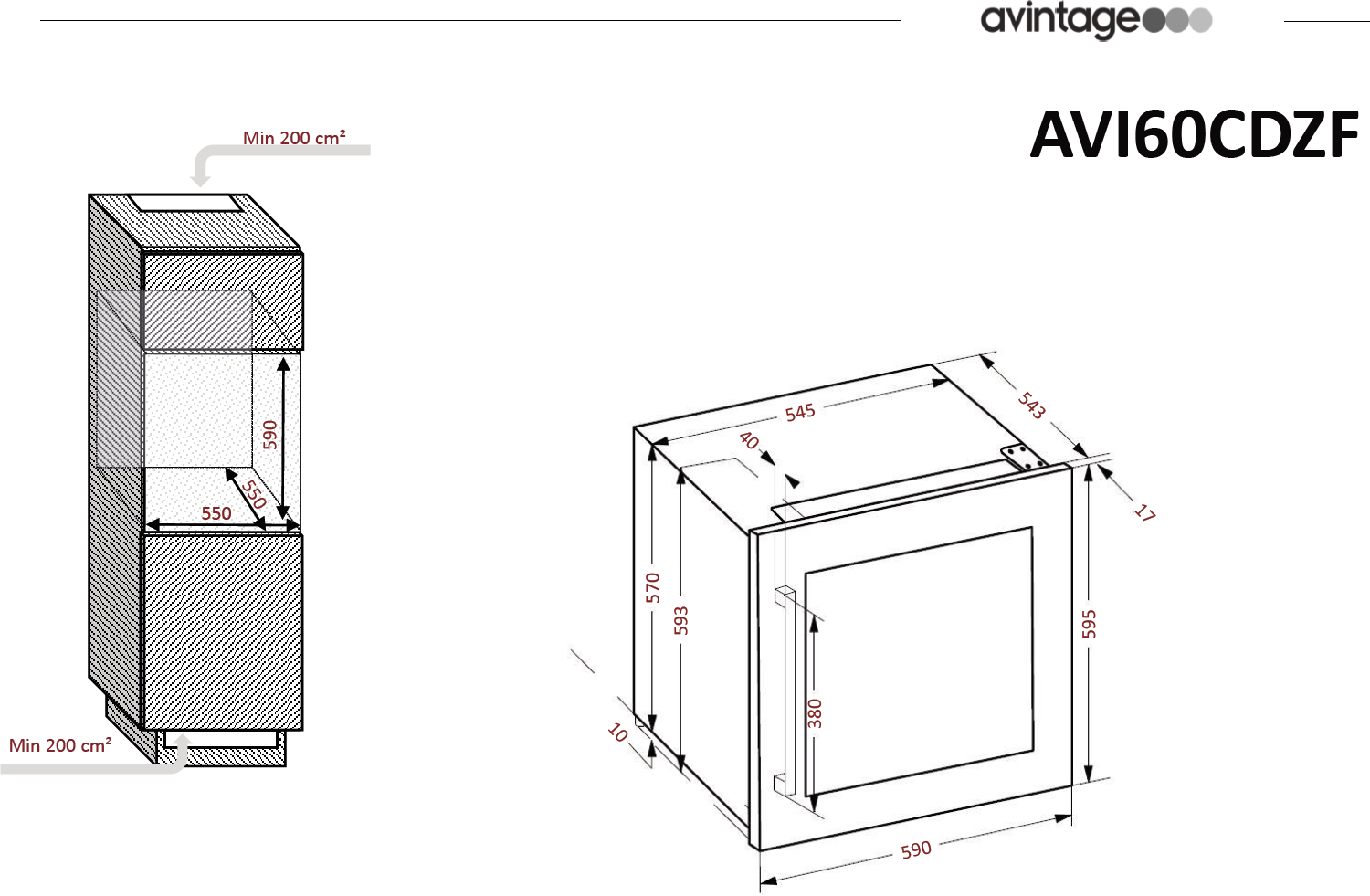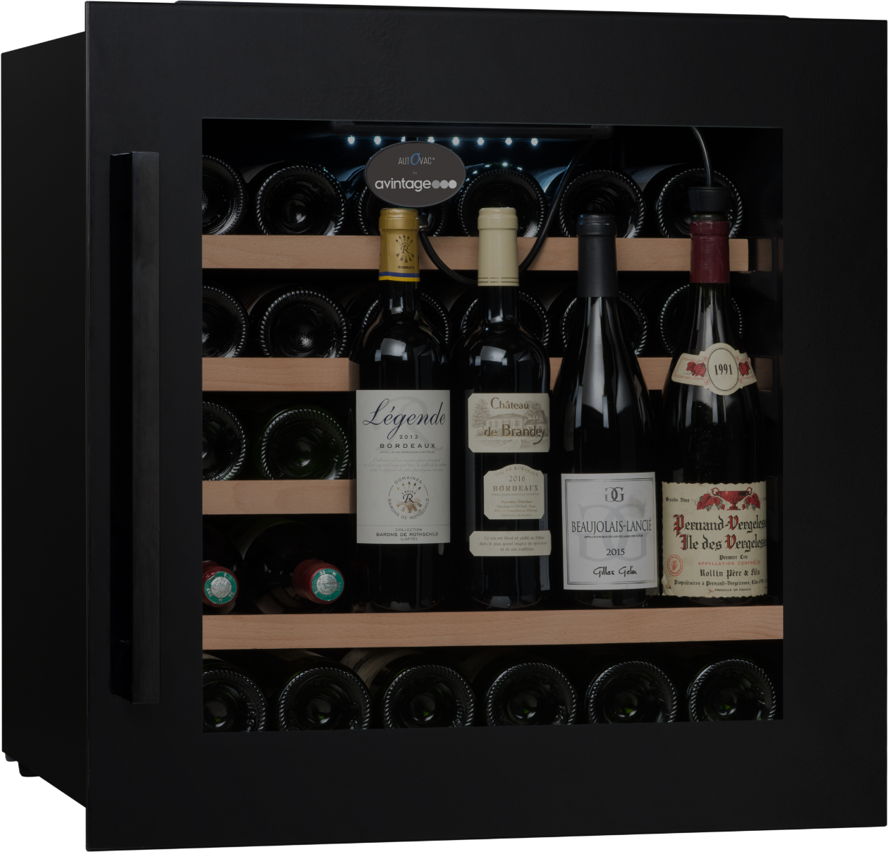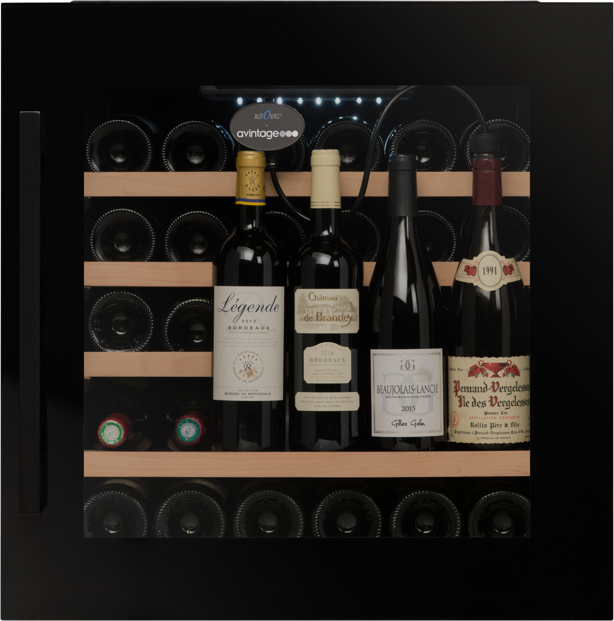 Exkluzivní vestavná vinotéka značky Avintage vhodná k instalaci do stejného korpusu jako standartní pečící trouba (60 x 60 cm); Celková kapacita 33 lahví, rozsah nastavení teplot: 5-20 °C; Integrovaný vakuový systém AutoVac umožňující delší uchovávání otevřených lahví s vínem; Prosklené dveře s černým madlem a rámem dveří z černého skla; 3 vrstvy tvrzeného šedě tónovaného skla s UV filtrem; Černé tělo vinotéky; Bílé LED osvětlení s vypínačem; 4 výškově nastavitelné nožky; 1 pevná police z bukového dřev; 3 ks výsuvných polic z bukového dřeva; Elektronická regulace teploty; Displej v bílé barvě; Automatické odmrazování; Regulace vlhkosti; Systém aktivní ventilace; Antivibrační systém; Kompatibilní s aplikací Vinotag;