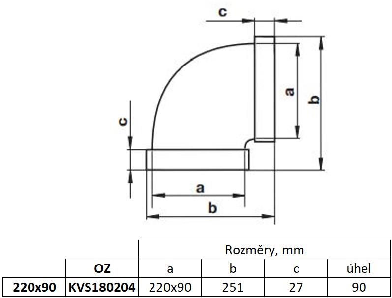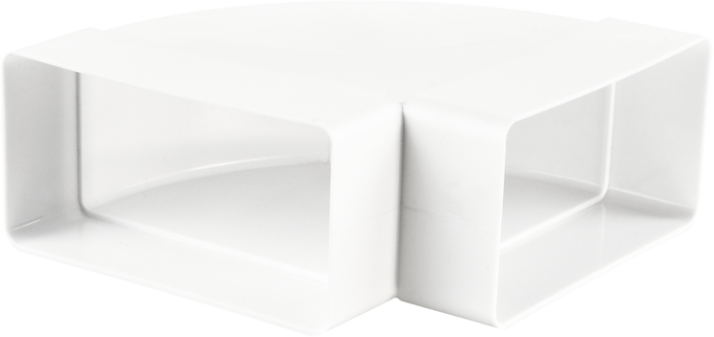 Vodorovné koleno, kanál plochý 220x90 mm, 90°, bílé, určeno k napojení plochého hranatého plastového potrubí.. Odbočení je v úhlu 90°. Teplotní odolnost vzduchovodů je +50°C až 0°C.