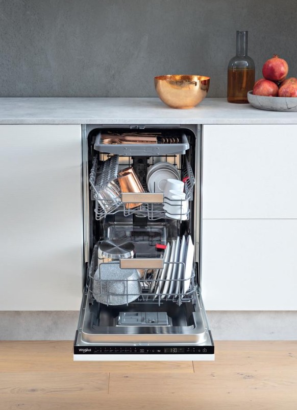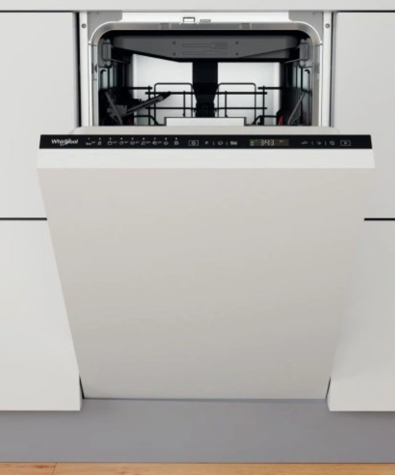 Whirlpool WSIP 4O33 PFE. Umístění spotřebiče: Plně vestavěné, Velikost produktu: Slim (45 cm), Barva dvířek: Černá. Počet míst: 10 kompletních, Hlučnost: 43 dB, Mycí programy: Economy, Sklo/Sensitive, Intenzivní 65 ºC, Předmytí, Rychlý. Spotřeba vody na cyklus: 9 l, Stupnice energetické účinnosti: A +++ až C, Spotřeba energie na cyklus: 0,659 kWh. Šířka produktu: 448 mm, Hloubka produktu: 555 mm, Výška produktu: 820 mm. Kategorie sušení: A, Roční spotřeba energie: 189 kWh, Roční spotřeba vody: 2520 l