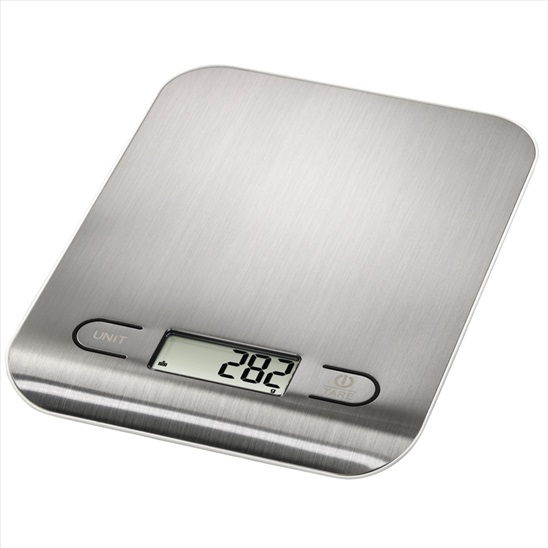 Xavax Stella, elektronická kuchyňská váha pro přesné vážení ingrediencí do 5 kg, stylový design z nerezové oceli, rozlišení: 1 g, možnost změny jednotky z gramů na mililitry a opačně, rozlišování mezi mlékem a vodou